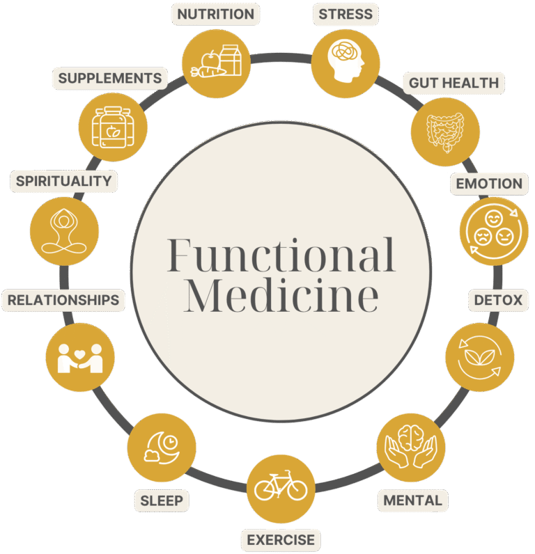 Functional medicine takes a whole-person approach — caring for your mind, body, and inner balance — to support your body’s natural healing process. Through this model, you’ll discover how a personalized, root-cause healing can restore your health and transform your well-being from the inside out.